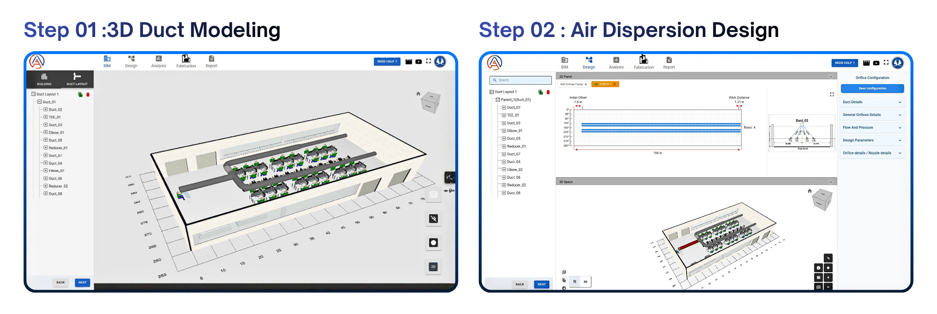 • 3D Duct Modeling - Creation of accurate, connected duct geometry with automated 3D generation from 2D layouts.